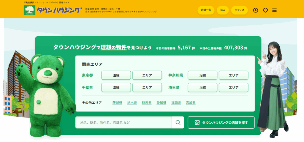 タウンハウジングは創業46年(2024年時点)、首都圏に直営143店舗を展開する大手不動産会社です。年間仲介実績は70,376件と業界トップクラスです。