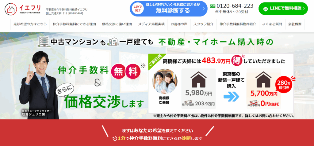 イエフリは広告費や人件費を抑える独自の運営体制により、仲介手数料無料で物件を提供しています。経験豊富な宅建士が価格交渉や相場調査を行い、オンラインでの相談も可能。コストを抑えながらも、質の高いサービスを提供する点が支持されています。