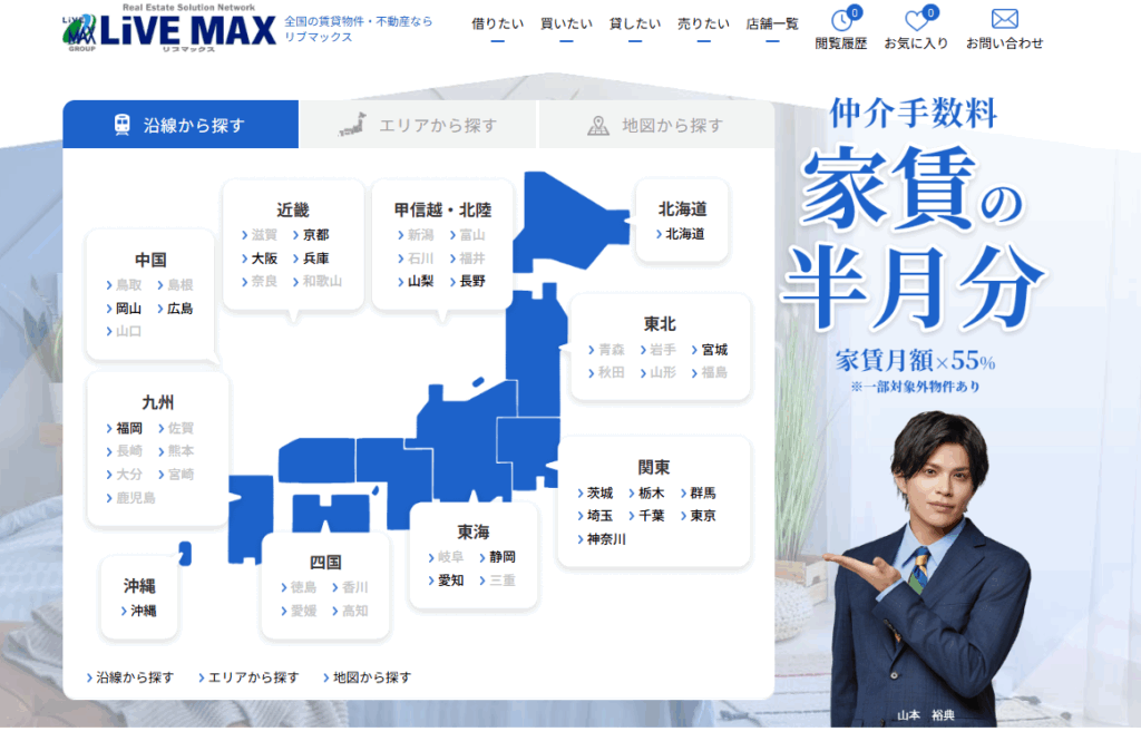 リブマックスは東京都内に20店舗、全国では53店舗を展開する大手賃貸不動産会社です。仲介手数料は家賃の半月分で、初期費用を抑えて契約できるのが特徴です。